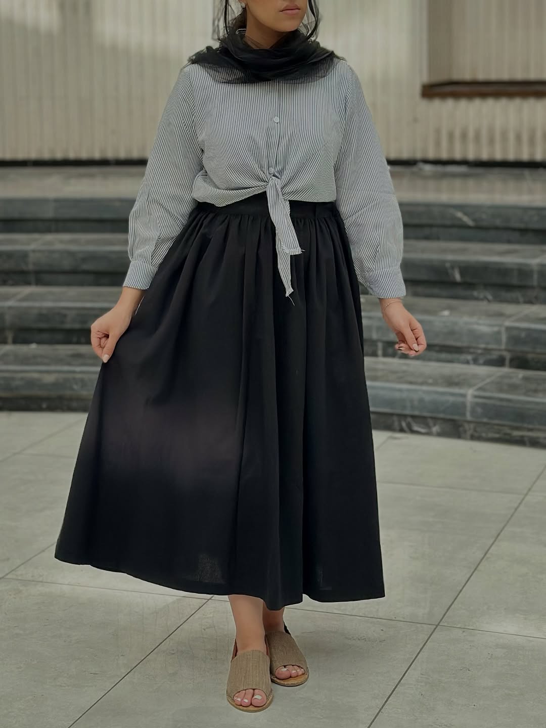 ست شیک و خاص شومیز گره‌ای راه‌راه و دامن لینن چین‌دار